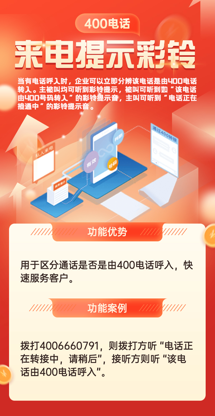 一个400电话号码可以关联多个手机或座机电话,适用数个客户同一时间打进,管理系统自动识别空闲电话线路接进来,避免了客户呼入占线,真正实现来电分流。与此同时,使用400电话可以真正帮助企业打造管理规范有序的公司服务形象。